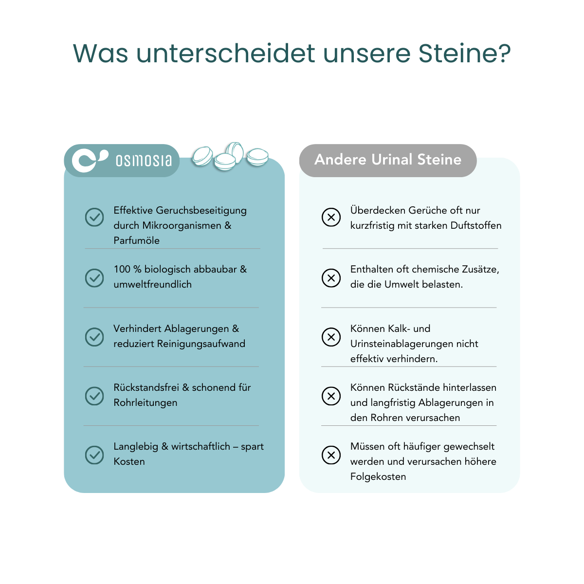 Erleben Sie selbst, wie die Osmosia Urinalsteine Ihre Sanitärhygiene revolutionieren können. Schaffen Sie eine saubere, frische und nachhaltige Umgebung für Ihre Besucher und Mitarbeiter.